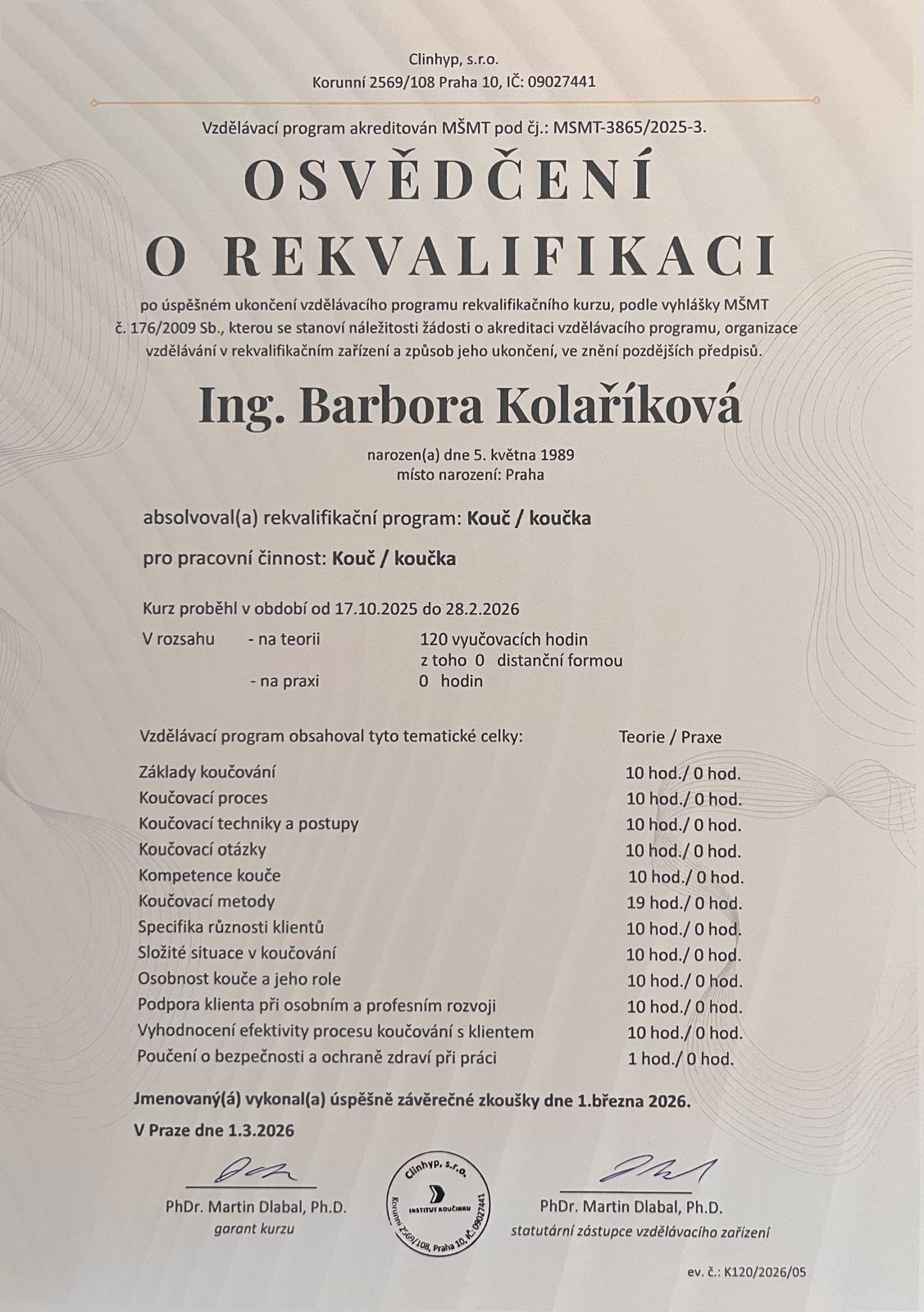 | Kouč/Koučka | Institut koučinku | 120 | Bez ICF akreditace | 2026 | Náhled |