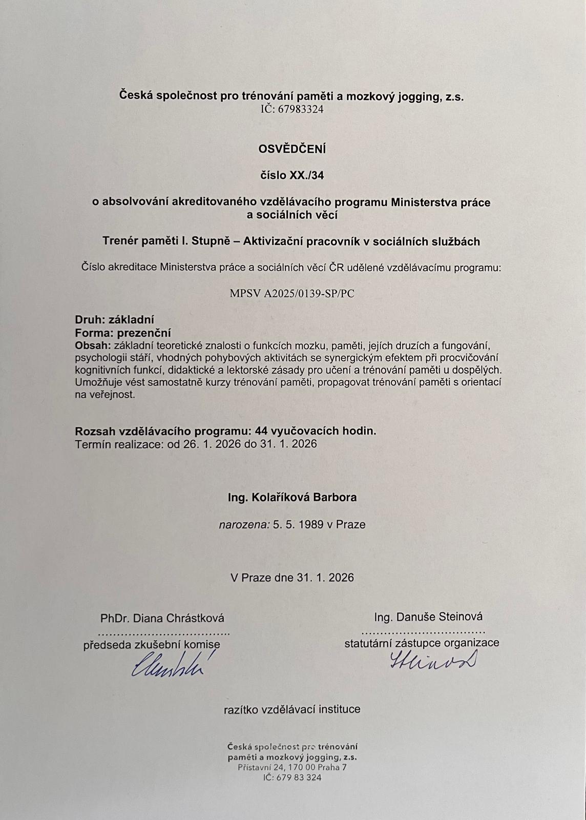 | Trenér Paměti | Česká společnost pro trénování paměti | 44 | Bez ICF akreditace | 2026 | Náhled |