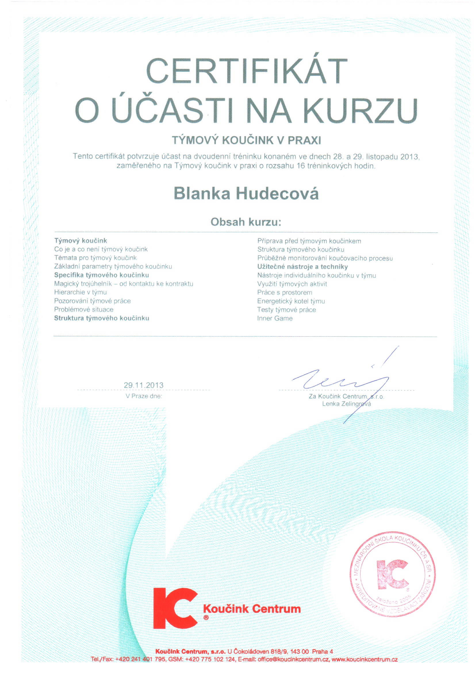 | Týmový koučink v praxi | Koučink Centrum | 16 | Bez ICF akreditace | 2013 | Náhled |