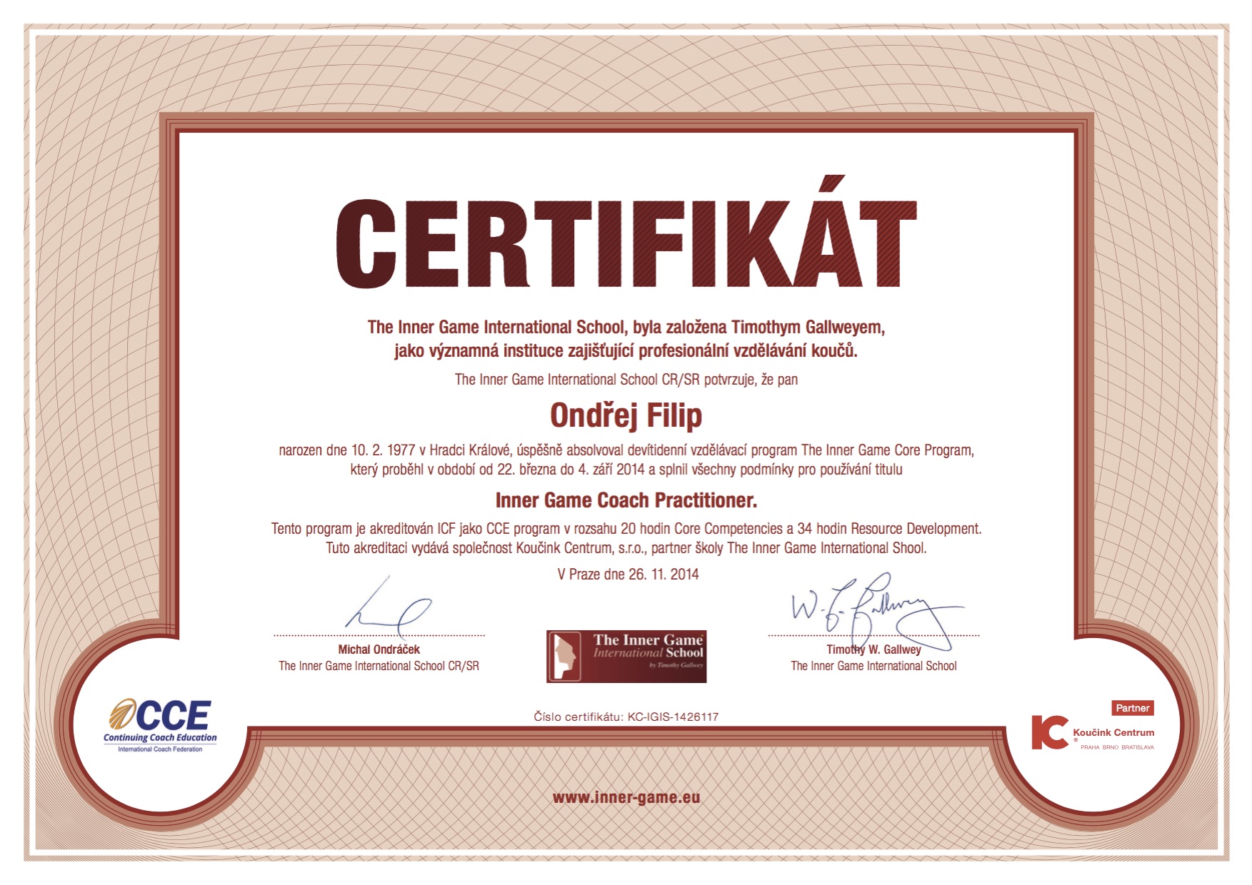 Jsem profesionální kouč a při své profesi se řídím etickými normami a profesními standardy ICF. Koučink je pro mě nejen naplňující povolání a řemeslo, ale i způsob života. Je to partnerský proces učení, kdy se sami učíme o nás samých, o tom jací jsme, jací bychom chtěli být a co je pro nás důležité. Je to proces, ve kterém jsme sami pro sebe tou nejvyšší autoritou a hledáme odpovědi na naše otázky.
