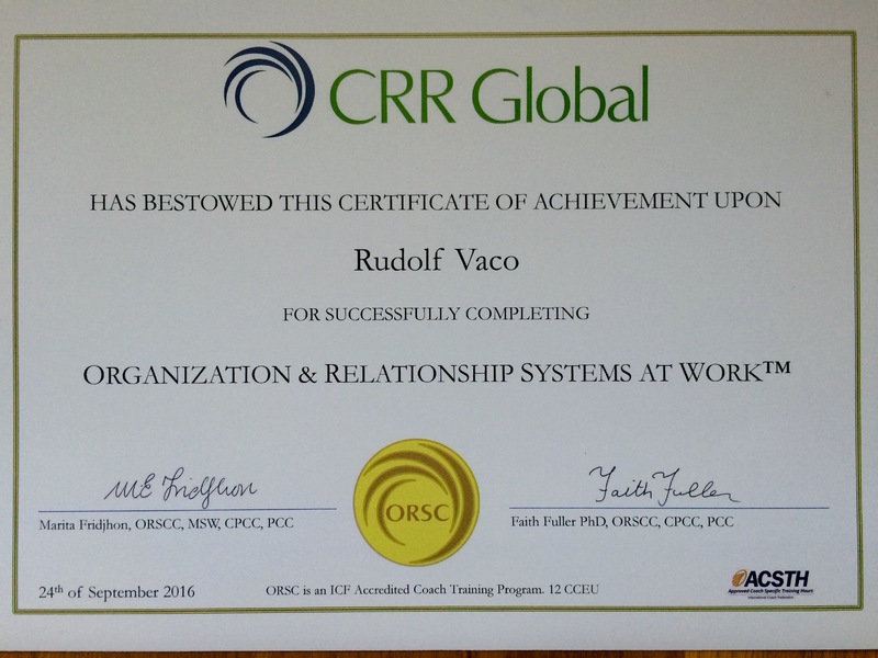 | ORSC je program akreditovaný ICF, zaměřený na koučování systémů v organizaci a v týmech, tak i v nepracovních vztazích partnerů a párů. Zásadní posun v koučování vychází z toho, že klientem je vztah, a nikoliv každý z účastníků systému. Další informace o programu na www.crrglobal.com | |||||