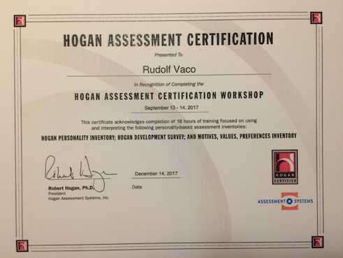 - CERTIFIKACE: HOGAN psychodiagnostické testy (HPI, HDS, MVPI), Assessment Systems, CZ, 2017