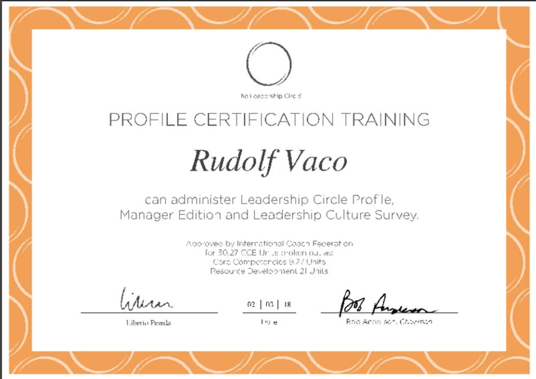 - CERTIFIKACE: Leadership Circle Profile certification, The Leadership Circle, US, 2018