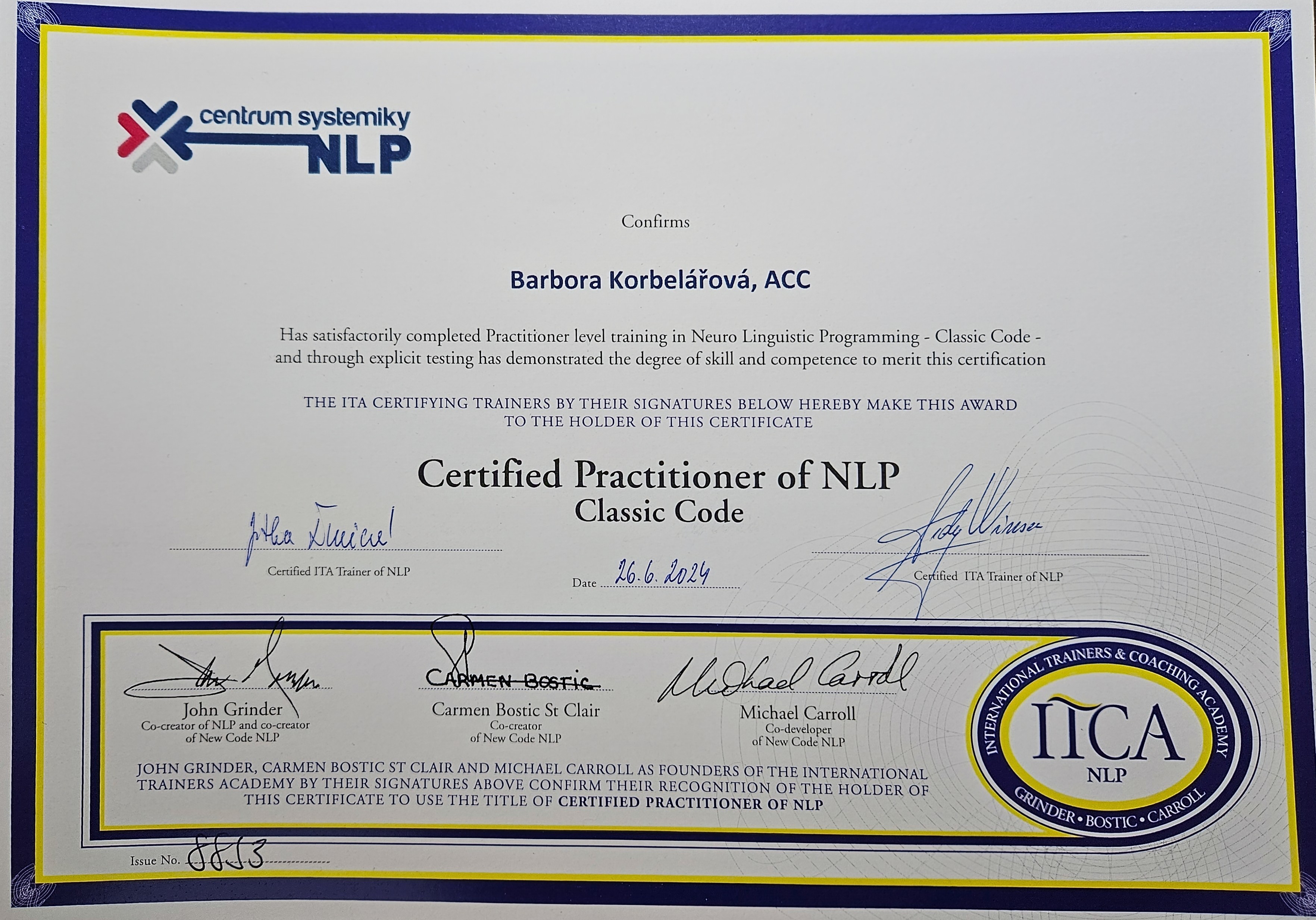 | NLP Practitioner | ITCA NLP, UK; Centrum systemiky a NLP | 66 | Bez ICF akreditace | 2024 | Náhled |