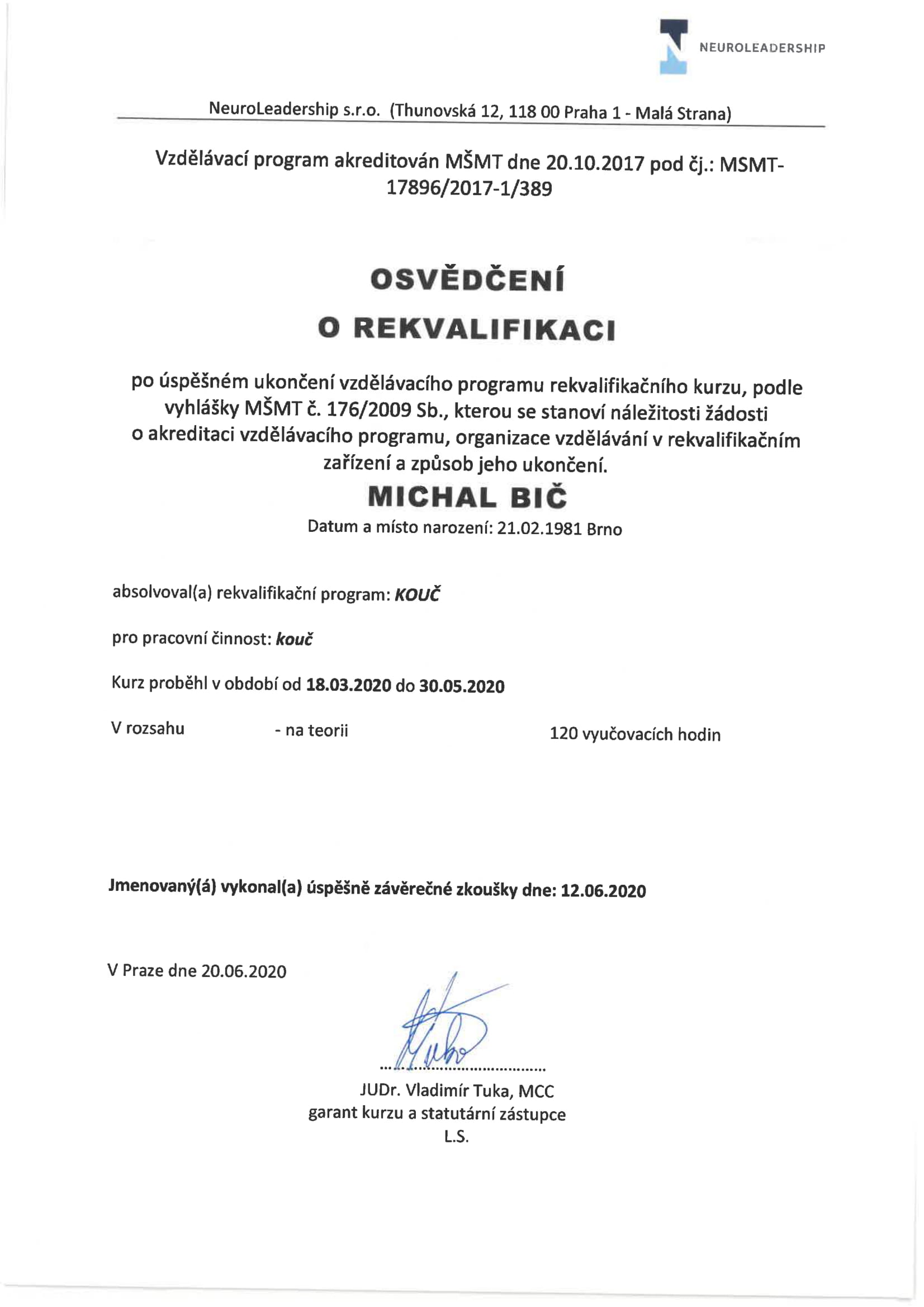 | MŠMT - Rekvalifikační kurz - kouč | Neuroleadership, s. r. o. | 120 | Nepoužívat | 2020 | Náhled |