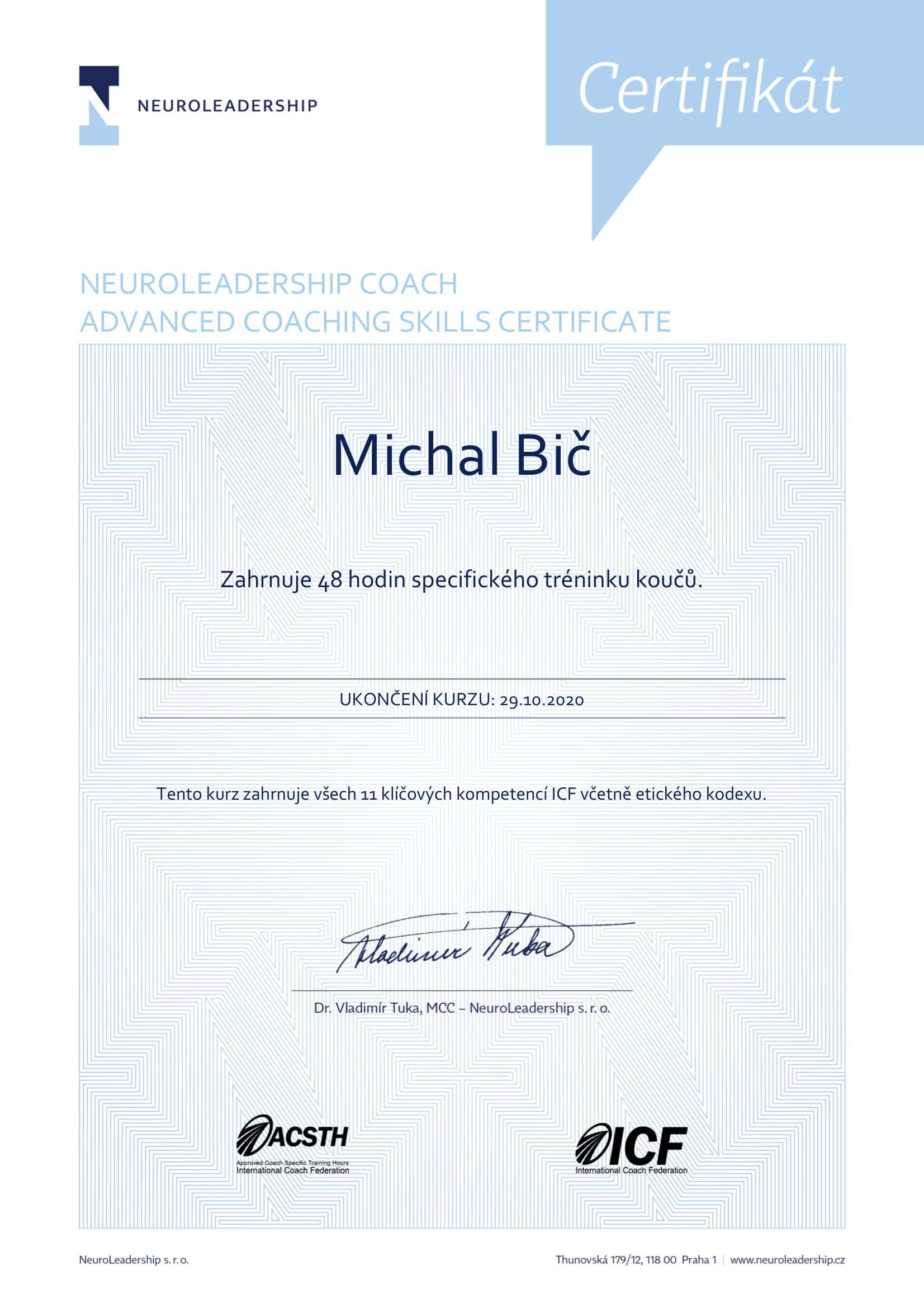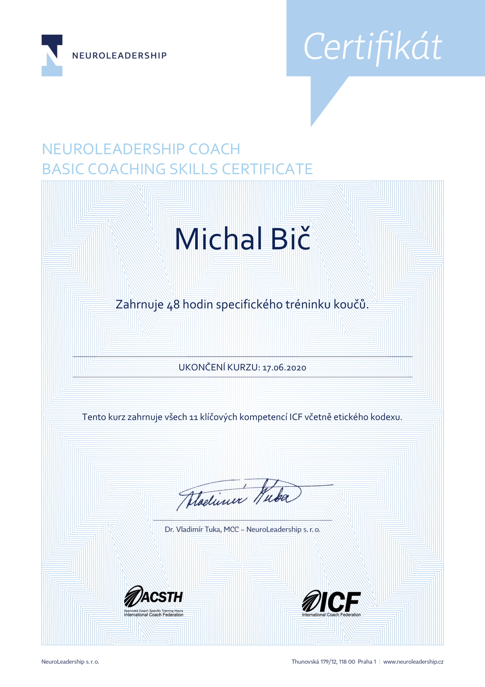 | Neuroleadership - Basic coaching skills | Neuroleadership, s. r. o. | 48 | ICF ACSTH | 2020 | Náhled |